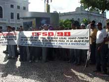 MANIFESTAÇÃO – Enquanto a solenidade de posse do novo desembargador acontecia no auditório, manifestantes que compõem uma comissão dos concursados que foram aprovados no concurso feito para a Polícia Militar, em 1998, reclamavam do lado de fora. Segundo eles, o objetivo da manifestação era conseguir uma audiência com o governador João Alves Filho.