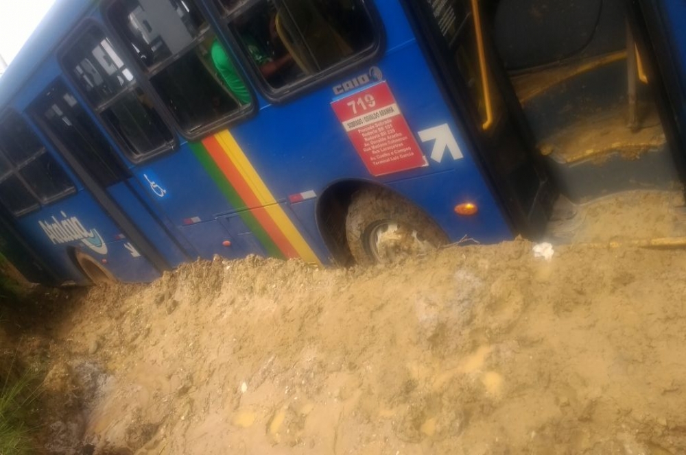 Um ônibus do transporte coletivo atolou ao passar por uma via do Povoado Sobrado, em Nossa Senhora do Socorro, no local que dá acesso ao Assentamento Rosa Luxemburgo. O veículo ainda foi apedrejado por uma passageira.