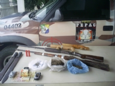 Com José Teotônio, o “Neguinho”, foram encontradas duas espingardas, onze trouxinhas de maconha, um pacote contendo sementes de maconha prontas para o plantio, três aparelhos celulares e R$200 em espécie, provavelmente fruto do tráfico de drogas. Já com José Carlos, o “Escambal”, foi encontrada uma escopeta de fabricação caseira e aproximadamente 100 gramas de maconha. Armas, celulares, drogas e dinheiro apreendidos na operação