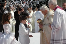 O menino Enzo recebe a comunhão das mãos do Papa, na missa do Campo de Marte/ Foto: Michelino Roberto