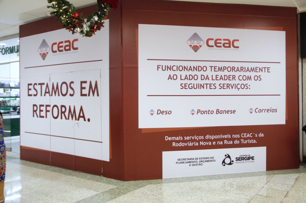 Mediante a realização da obra do Ceac Riomar iniciada no dia 30 de outubro e a grande procura por serviços neste Centro de Atendimento ao Cidadão, a Secretaria de Planejamento, Orçamento e Gestão (Seplag), através dos órgãos parceiros e do Riomar Shopping, optaram por disponibilizar temporariamente um novo espaço para prestação de alguns serviços a população.