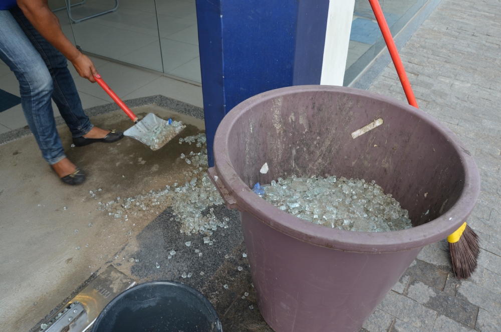A funcionária responsável por serviços gerais fez a coleta dos vidros espalhados na entrada da agência e logo demonstrou o temor quando percebeu a aproximação da equipe de reportagem. “Pelo amor de Deus, minha foto não. Não façam fotos comigo. Aqui a coisa não é nada boa e não dá pra gente ficar aparecendo”, desabafou.