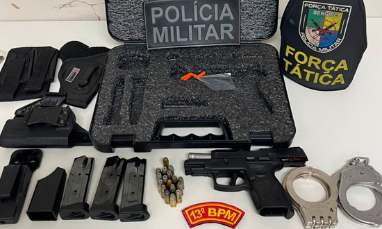 A Força Tática do 13º Batalhão da Polícia Militar apreendeu uma pistola e acessórios na noite do último sábado, 24, no bairro Aruana, em Aracaju. A ação ocorreu após atendimento a uma ocorrência de violência doméstica.