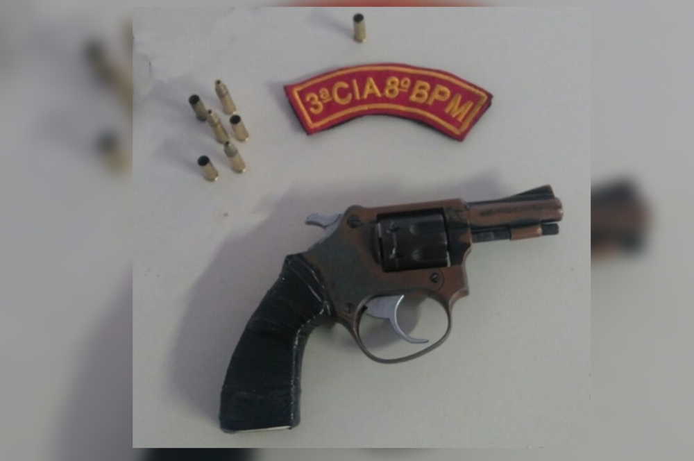 A guarnição foi acionada para atender uma ocorrência de agressão, mas, enquanto se deslocava, foi solicitada por populares informando que uma pessoa estava efetuando disparos em via pública. Durante as diligências, os policiais encontraram um suspeito com as características passadas e, com ele, localizaram um revólver calibre 22, com sete munições, sendo três intactas e quatro deflagradas.