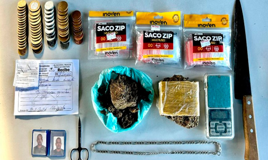 No local onde o suspeito se encontrava, os policiais localizaram, sobre uma caixa de isopor, diversos insumos utilizados para o tráfico ilícito de drogas, entre eles uma balança de precisão, sacos plásticos tipo zip lock, faca, tesoura, dinheiro em moedas e aproximadamente 230 gramas de substância análoga à maconha.