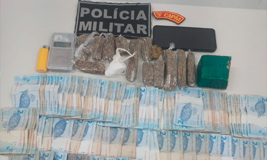No imóvel, os policiais apreenderam uma sacola contendo aproximadamente 353 gramas de substância análoga à maconha e 25 gramas de substância análoga à cocaína, além de uma balança de precisão e dinheiro em notas de pequeno valor.