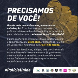 Na próxima segunda, 26, a partir das 7h, em frente ao Palácio dos Despachos, o Movimento Polícia Unida concederá uma entrevista coletiva sobre o lançamento da campanha em prol do adicional de periculosidade.