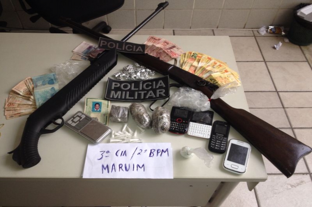 A prisão foi registrada no município de Maruim e na oportunidade os militares encontraram com Daniel R$ 1.500,00 em dinheiro além de um rifle calibre 38, 15 cápsulas contendo cocaína e mais cerca de 50 cápsulas vazias, pedras de crack, 25 papelotes de maconha, uma espingarda de pressão e uma balança de precisão.