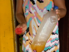 Proprietária do bar mostra a garrafa de bebida dos policiais