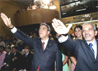 Nem o calor, nem o fato de muitos terem passado a noite em claro por conta do Reveillon afastou familiares, correligionários e amigos do evento. Em uma mesa presidida pelo vereador eleito Fábio Henrique Carvalho (PDT), os 19 parlamentares escolhidos pelo voto A solenidade, que estava marcada para iniciar às 10 horas, só começou – de fato – após às 11. A abertura dos trabalhos foi feita pelo presidente da mesa, Fábio Henrique, secundado pelo primeiro-secretário, o também vereador eleito no último pleito, Jony Araújo (PL). Além deles, compunham a mesa o deputado federal Jackson Barreto (PTB), o ex-senador José Eduardo Dutra, a deputada estadual Ana Lúcia Menezes (PT) e o prefeito eleito de Japaratuba, Gerard Olivier (PT), além do senador Antônio Carlos Valadares (PSB). DISCURSOS E PROMESSAS – Após a posse do prefeito, vereadores representantes dos partidos que compõem a Casa durante este quadriênio, tiveram oportunidade de falar. O pastor Daniel Cruz, em seu discurso, não deixou de salientar que, após Outro destaque foi para o vereador Vinícius Porto (PFL). Em seu breve discurso, ele aproveitou para mandar um recado para o prefeito Marcelo Déda e a bancada governista. “Nosso partido não tem característica de fazer oposição sistemática, mas queremos avisar que o PFL, a partir de hoje, vai trabalhar muito nesta casa e O vereador mais votado no último pleito, Fábio Henrique (PDT), com 6.672 votos, declarou por sua vez que o trabalho que pretende desenvolver na Câmara não será marcado por interesses políticos. “Seremos pautados pelos interesses do povo”, garantiu. Já Marcelo Déda, afirmou que os votos que recebeu – que perfizeram 71,3% dos votos válidos em Aracaju – significam uma responsabilidade muito grande. “Eles não foram parar no meu bolso. Foram para os meus ombros. Não devo, e ninguém aqui deve, ficar envaidecido pelos votos que recebeu. Devemos ser gratos e ter noção da responsabilidade que nos espera. Só posso garantir, a este povo que confiou em mim outra vez, que chego aqui com a mesma energia que tinha em 2001. E não tenho direito de decepcioná-los”, declarou o prefeito eleito. Após a cerimônia na Câmara – e uma breve homenagem ao sesquicentenário de Aracaju -, Déda se dirigiu à frente da sede da Prefeitura, na praça Olímpio Campos, onde fez o primeiro discurso oficial, já como prefeito empossado. Ele também recebeu a mais alta honraria municipal, a medalha Grão-Mestre da Ordem do Mérito Serigy. Conheça os nomes e partidos dos vereadores empossados: Daniel Cruz Forte – PSC Elber Andrade Batalha de Góis – PSB Emanuel da Silva Nascimento – PT Jony Santana de Araújo – PL Fábio Henrique de Santana Carvalho – PDT José Evandro Franca – PTB José Gonzaga de Santana – PMDB José Iran Barbosa Filho –PT José Ramos da Silva – PSB Josenito Vitale de Jesus – PRONA Juvêncio José Passos de Oliveira – PFL Manuel Marcos dos Santos – PFL Maria Conceição Vieira Santos – PT Pedro Andrade Ribeiro – PT Sandro Silva dos Santos – PV Sérgio Carlos de Jesus Góes – PL Tânia Soares de Souza – PCdoB Valdir dos Santos – PTB