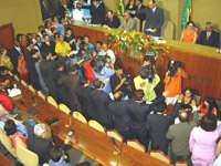 O plenário e a galeria da Câmara de Vereadores de Aracaju foram pequenos para comportar as centenas de pessoas que tentaram assistir à solenidade de posse dos 19 vereadores eleitos no último pleito, bem como do prefeito Marcelo Déda (PT) e do vice-prefeito Edvaldo Nogueira (PCdoB). A cerimônia, que iniciou no meio da manhã deste sábado, dia 1º de janeiro de 2005, se prolongou até o início da tarde.