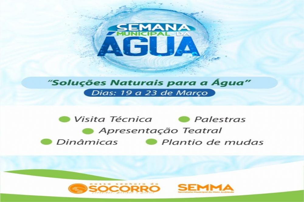 No dia 22 de março é comemorado o Dia Mundial da Água, data instituída no ano de 1992 pela Organização das Nações Unidas (ONU), com o objetivo de discutir temas relacionados à esse bem vital a existência da vida. Pensando dessa forma a Prefeitura de Nossa Senhora do Socorro, através da Secretaria Municipal do Meio Ambiente (Semma), realizará uma semana de ações voltadas à conscientização dos cidadãos, em relação à água.