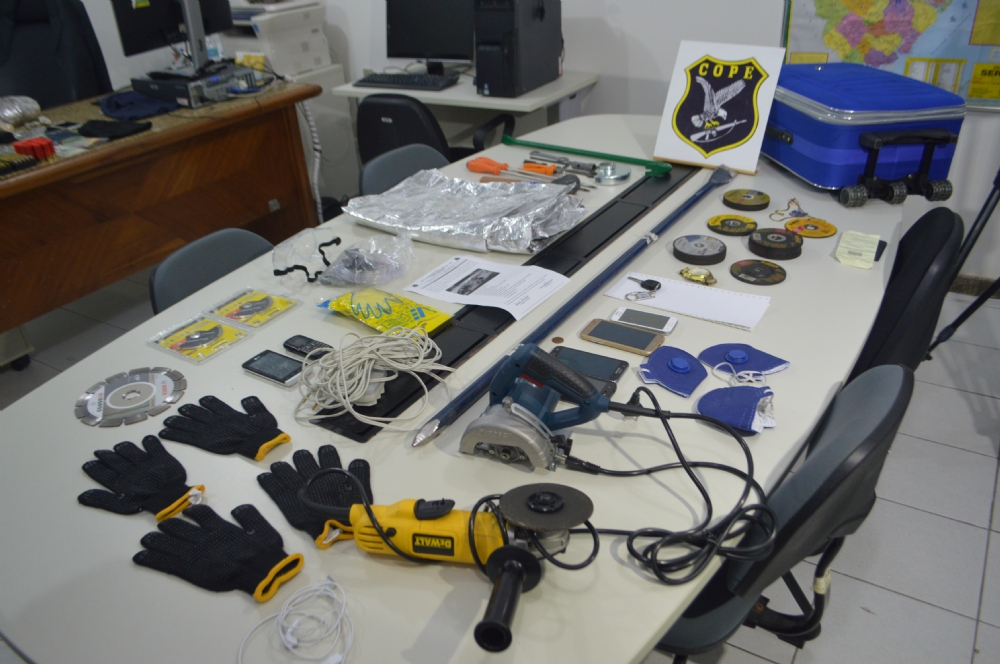 Durante as diligências, foram apreendidos os equipamentos utilizados para efetuar os crimes, como maquita, discos de corte, extensão, alicate, esmerilhadeira, chaves de fenda, marretas, luvas, e alavanca, além de seis aparelhos celulares.