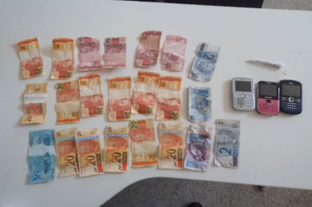 A PM efetuou diligências e abordou o quarteto em um ponto de ônibus da cidade. Com o grupo, foram apreendidos R$ 411, sendo cerca de R$ 400 em notas falsas; três telefones celulares e um cigarro de maconha.