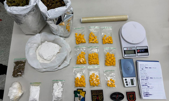 Dentro da mochila, os policiais encontraram 1,049 kg de maconha, 536 g de cocaína e 191 g de uma substância semelhante à droga sintética (ecstasy), além de duas balanças de precisão, um rolo de plástico filme e um caderno com anotações da contabilidade do tráfico.