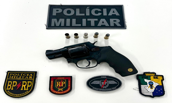 Foram realizadas buscas nas imediações, mas o suspeito não foi localizado. O material apreendido, um revólver calibre .38, com cinco munições intactas, foi encaminhado à autoridade policial para as providências legais.