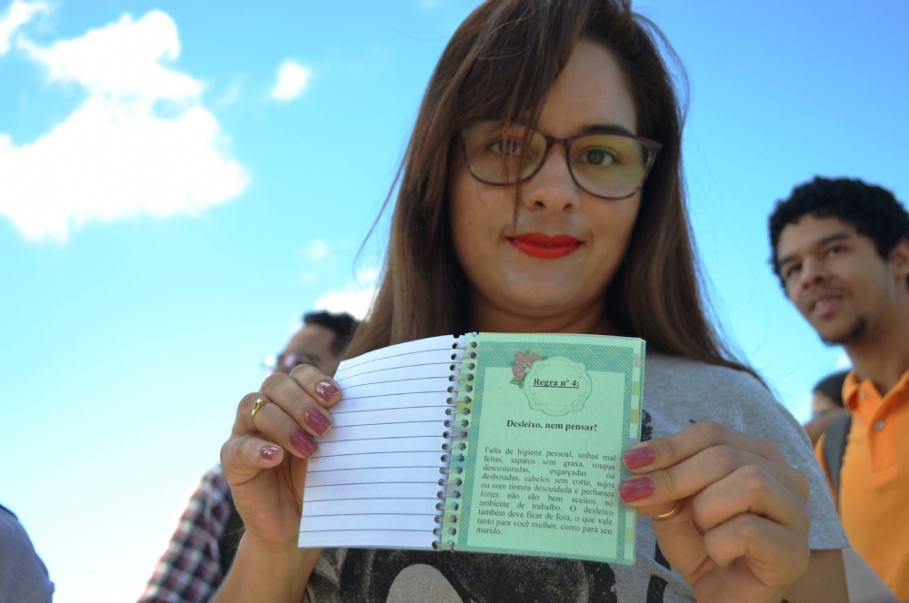 “…cabelos sem cortes, sujos ou com tintura descuidada e perfumes fortes não são bem aceitos no ambiente de trabalho”, diz a regra nº 4. O material foi distribuído no dia 8 de março, no Dia Internacional da Mulher. O que era para ser uma comemoração à data, virou objeto de reclamação das servidoras. “Uma colega chegou pra mim reclamando do conteúdo. Ela achou um absurdo a forma machista como isso foi passado. São 49 regras dizendo como a mulher deve se apresentar, desde a cor do batom até a das roupas”, disse a auxiliar de enfermagem e representante do Sindicato dos Servidores da Universidade Federal de Sergipe (Sintufs) Lucimar Costa. “A revista chega até a dizer que não se deve trabalhar com roupas ‘hippies’ e ultrapassadas e sabemos que cada um tem um estilo próprio. Isso é preconceito”, reforçou Lucimar.