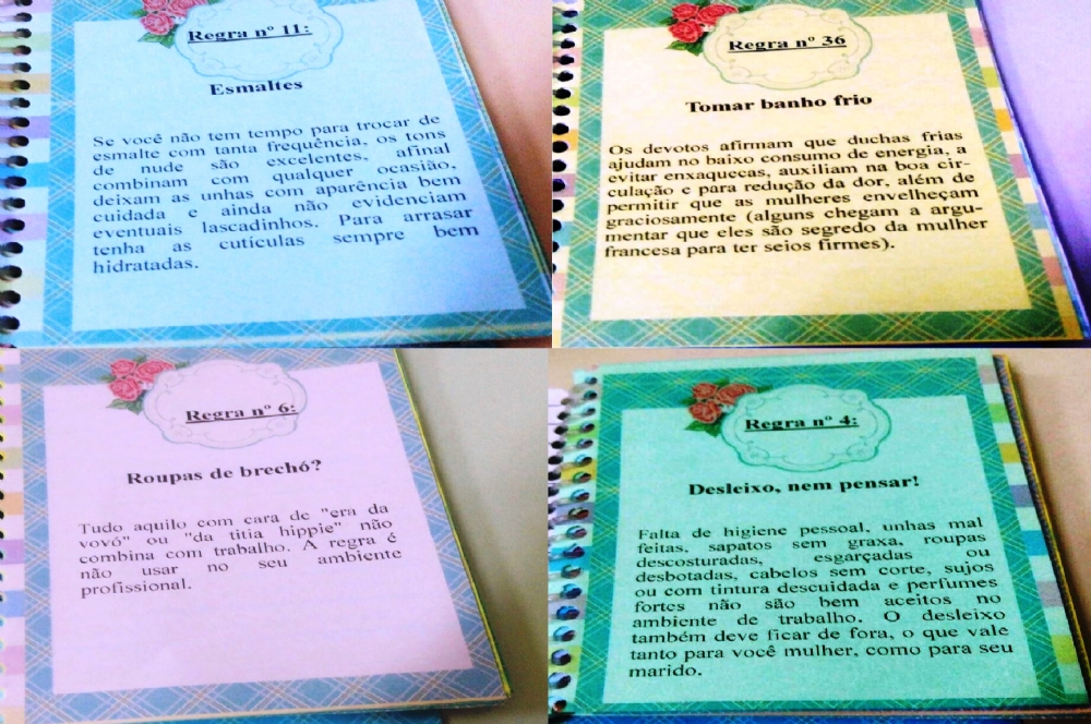 Nas fotos ao lado é possível ver algumas das regras. Entre dicas de saúde e de maquiagem, os sobre benefícios do banho frio. “Alguns chegam a argumentar que eles são segredo da mulher francesa para ter seios firmes”, diz a regra 36.