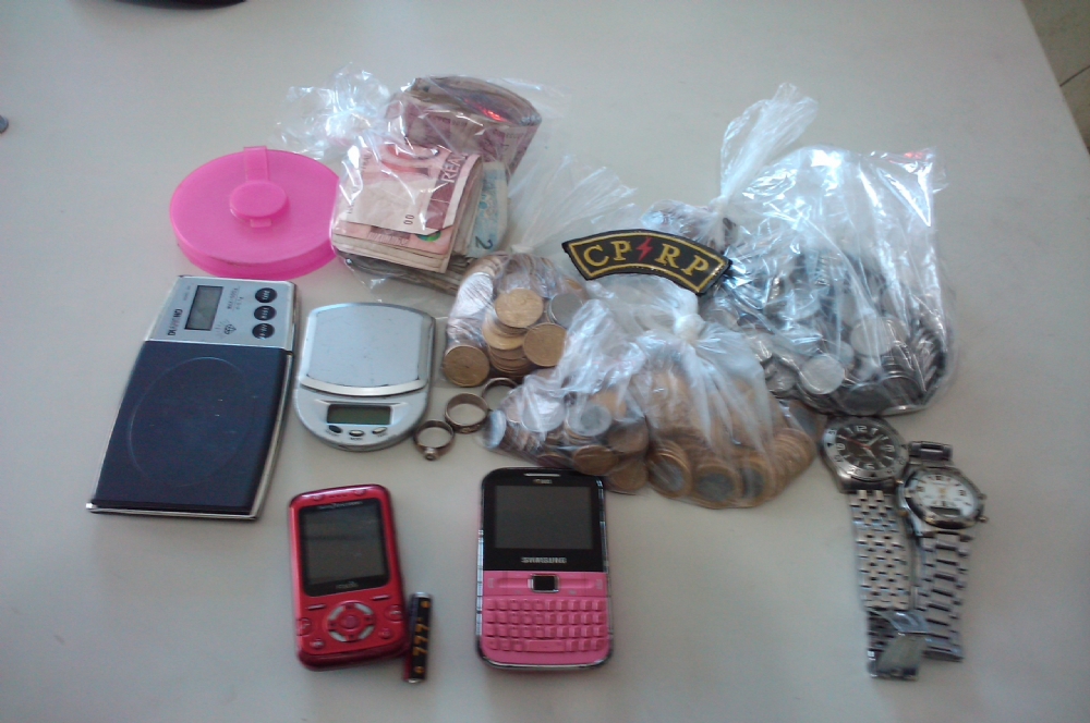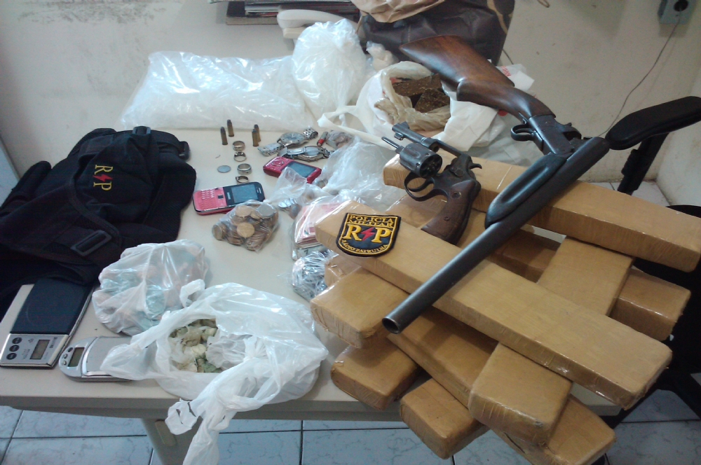 De acordo com soldado Adriano da RP, foram apreendidos 10kg de maconha, 315g de crack embalados pra venda, 220 g de cocaína, uma escopeta, 1 revólver calibre 38, quatro munições, uma capa de colete, 500 reais em espécie, 2 balanças da precisão e 1000 cápsulas vazias para cocaína.