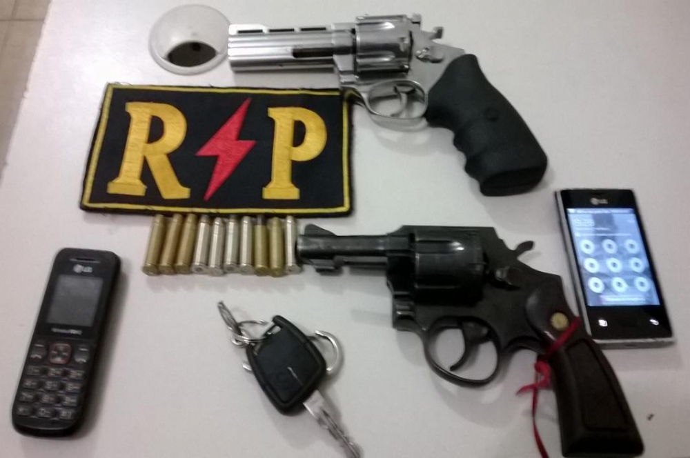 Após a abordagem e vistoria na interior do veículo foram encontrados dois revólveres calibre 38 mm com 10 munições intactas e constatado através de consulta ao Centro Integrado de Operações de Segurança Pública (CIOSP) que o veículo tinha restrição de roubo.