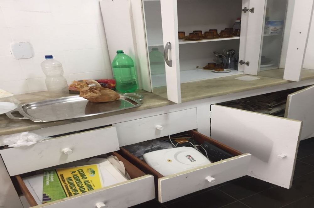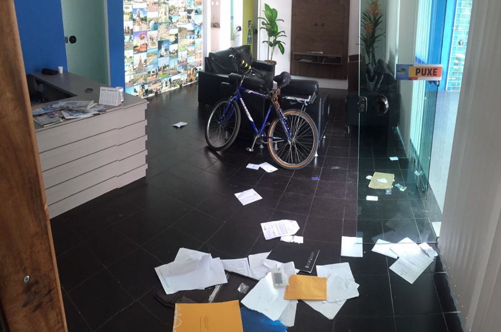 Os suspeitos arrombaram a fechadura da porta da frente e adentraram no local levando diversos objetos. Foram levados um talão de cheque, um notebook, um computador completo com impressora, um filtro de água, fogão e micro-ondas. O local foi vasculhado e documentos foram espalhados pelo chão.