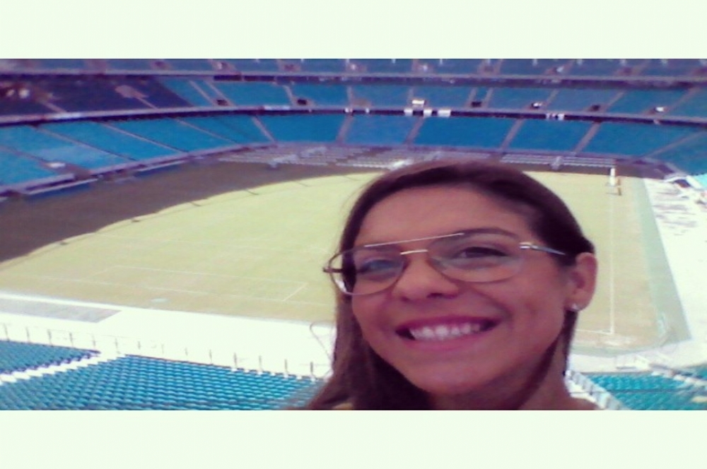| Mariana Peixoto em uma selfie tirada no Estádio Arena Fonte Nova na Copa do Mundo (Foto: Facebook) |