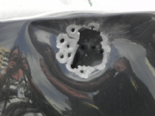 carros para ver se tem algum médico”, gritava um policial, mas ninguém transportava a vítima. Marcas dos tiros no carro