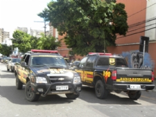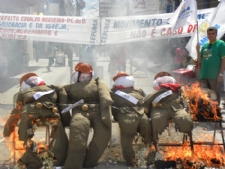 Durante a ação do sindicato nesta manhã, várias viaturas da Polícia Militar foram até o local, mas não chegaram a intervir na manifestação. Um guincho também foi acionado pela Superintendência Municipal de Transportes e Trânsito (SMTT) para retirar o carro de som da categoria, mas após negociação ficou decidido que o Sepuma pagaria a taxa do guincho e “Essa é uma manifestação pacífica, mas lamentavelmente chamam a polícia e até o guincho para tentar retirar a gente daqui, mas vamos permanecer até que possamos queimar os bonecos que representam os torturadores. Essa situação expõe uma democracia onde os pequenos são algemados, amordaçados e humilhados, mas nossa manifestação é pacífica”, reforça o sindicalista Getúlio Gomes Nunes. O presidente do Sepuma, Nivando Fernandes, lembrou que os cinco bonecos, denominados de Zé Pelinha, Zé Veneno, Curió, Curisco, Virgulino e Lampião, representam figuras que contribuíram há quatro anos para a sua prisão e do colega Pitanga. “O Sepuma hoje mostra aqueles momentos de terror e pânico que todos nós sofremos. Aquela Punição Segundo Nivaldo Fernandes até hoje o sindicato luta na Justiça para que os três militares que se envolveram na ação do dia 23 de maio de 2006 sejam afastados das suas funções. “Esses militares demonstraram que não tinham preparo para agir em um momento de crise. Eles chegaram a serem colocados na reserva, mas hoje estão trabalhando normalmente no atual Governo”, declarou. Após a queima dos bonecos, a manifestação prosseguiu ao ritmo do tradicional forró pé de serra. Por Kátia Susanna