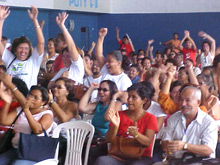 Hoje pela manhã, na sede do Continguiba, vários segmentos de trabalhadores do Estado se reuniram em uma Assembléia Geral Unificada. Dentre as categorias participantes, estiveram o Sintese, o Sintasa, o Sinpol, o Sindgráfico, o Sindsejes, a CUT e o DCE da UFS. O objetivo era um só: fortalecer o movimento de todas as categorias, que vinha sendo realizado de forma pontual por cada uma delas. De acordo com o representante do Sindicato dos Policiais Civis (Sinpol), Manuel Messias, “a idéia é somar forças, fazer uma somação, porque até agora a gente vem fazendo movimentos isolados e o Governo do Estado, de certa forma, vem tentando minar as paralisações para ver se acaba com o Porém, a partir desse objetivo de dar mais força à luta de cada categoria, os servidores buscavam, ainda, soluções viáveis contra a questão do reajuste salarial, que até agora não foi acenado pelo Governo do Estado. Com isso, acredita-se que outras questões, como as condições insalubres de trabalho e o descaso com o patrimônio também venham a ser solucionadas pelo governo estadual. Dentro disso, cada categoria apresentou, ainda, suas pautas de reivindicação. Porém, as maiores discussões ainda eram relacionadas ao Sindicato dos Trabalhadores em Educação do Estado de Sergipe (Sintese). A assembléia foi coordenada por este sindicato e pelos servidores do Sindicato dos Trabalhadores na Área de Saúde do Estado de Sergipe (Sintasa). Os primeiros lutavam contra a forma de avaliação imposta pelo governo do Estado e pela não sinalização da Secretaria de Estado SINTESE – A assembléia começou com a palavra do vereador Iran Barbosa, um dos diretores do Sindicato. Iran, assim como a deputada Ana Lúcia, que também estava presente, se ativeram, principalmente, à problemática da avaliação dos professores. De acordo com eles, a política de avaliação, da forma como está sendo feita, vai de encontro a tudo aquilo o que os professores sempre lutaram. Segundo o vice-presidente do Sindicato, Carlos Sérgio Lobão, a avaliação funciona da seguinte maneira: os professores são julgados pelos diretores, alunos e pelos próprios professores, podendo O vice-presidente disse ainda, que a forma como os professores estão sendo avaliados poderia prejudicar os próprios profissionais, já que o receio é que sejam analisada a pessoa, e não todo o sistema de magistério. Assim como ele, pensa a deputada Ana Lúcia. “Isso não é uma avaliação, é um controle de comportamento. No questionário, temos perguntas como, por exemplo, ‘o professor é cortês?’, ora, o que é ser cortês? Os critérios de avaliação são totalmente subjetivos e voltados para o comportamento do profissional e não ao projeto pedagógico. Além disso, muitas coisas que são culpa da desorganização do próprio sistema são jogadas para o professor. Há casos, por exemplo, de alunos que já concluíram o ensino médio e se rematriculam apenas para conseguirem a carteira de passe escolar, ou seja, haverá uma transferência de culpa”, desabafou a deputada. De acordo com o presidente do Sintese, Joel Almeida, a comunidade educacional já está se preparando para uma possível resposta do Governo do Estado, através de propagandas que possam vir a tentar prejudicar o movimento: “O governo está percebendo que estamos nos organizando e ele precisa, de alguma forma, se contrapor a isso. O Estado tem poder financeiro para fazer a propaganda que quiser. Sempre houve a tentativa de se jogar a sociedade contra as categorias”, explica. SINTASA – A questão da saúde também é algo que vem preocupando os sergipanos, principalmente aqueles que necessitam utilizar os serviços do Hospital Governador João Alves Filho. Para Augusto Couto, presidente do Sintasa, o sucateamento do serviço público está insuportável. “No João Alves, são 600 pacientes por dia. Ninguém consegue entrar, é praticamente é uma Outro problema, também alocado no HGJAF, é a questão da contaminação hospitalar. “Deixar acontecer isso dentro do hospital, diante da contaminação, é um absurdo. Se você juntar pacientes de vários tipos de diagnóstico e fizer um cruzamento, pode causar problemas piores. O servidor pode até ficar doente”, lamenta. Diante destes e de outros problemas relativos às várias categorias profissionais, é que surge a paralisação. Depois dela, espera-se que casos como o que conta a professora Ubaldina Santana não se repitam: “A excelência, no Atheneu, continua cada vez maior. Ontem, os alunos tiveram que ser mandados para casa por causa da falta d’água no colégio. A revolta foi tanta que para evitar uma confusão maior, a diretoria mandou todos para casa”. Por Wilame Amorim Lima Da Redação do Portal InfoNet