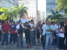 na história da categoria porque nunca ninguém desafiou o poder Judiciário. “Nunca ninguém fez greve dos servidores da Justiça, muito menos em frente ao Palácio de Justiça. Para eles, passa a ser até um afronta, mas é preciso fazer isso”. Manifestantes apoiando a luta dos servidores de Justiça