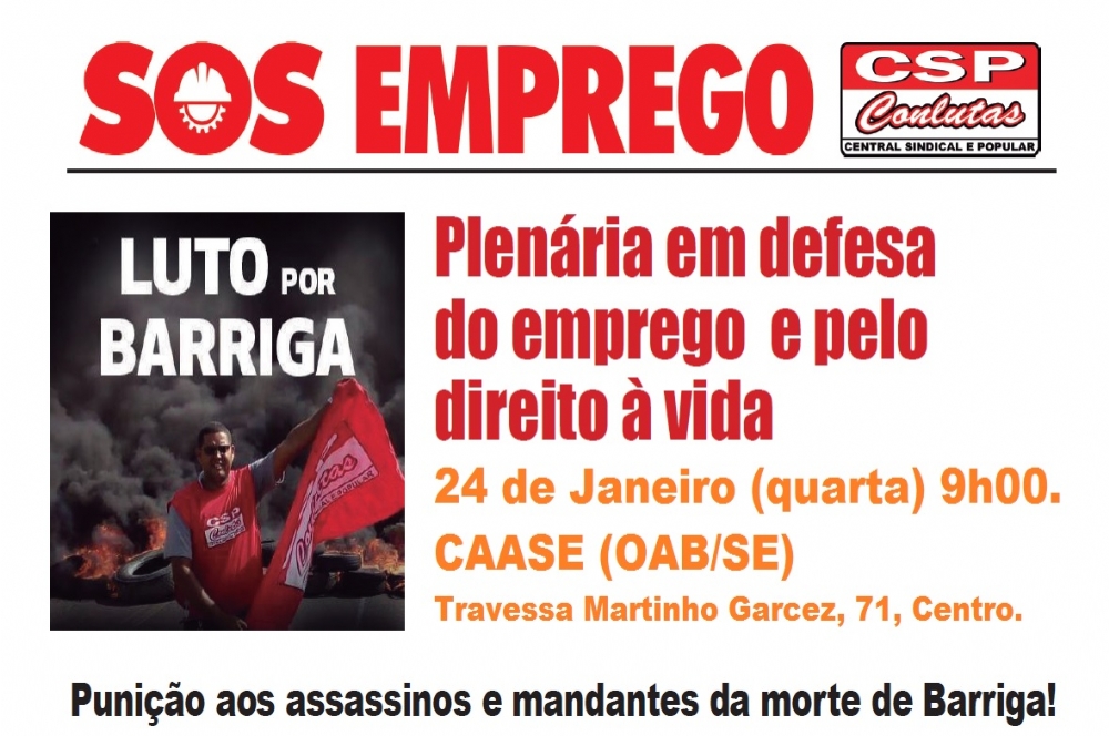 A Central Sindical e Popular (CSP), Conlutas e o movimento social SOS Emprego realizarão uma plenária na próxima quarta-feira. 24, com a temática “em defesa do emprego e pelo direito à vida”, com o objetivo de cobrar da Secretaria de Estado da Segurança Pública agilidade na investigação do assassinato do líder do movimento SOS Emprego, Clodoaldo dos Santos, conhecido como Barriga, morto a tiros no dia 14 de dezembro na porta da residência na Barra dos Coqueiros.