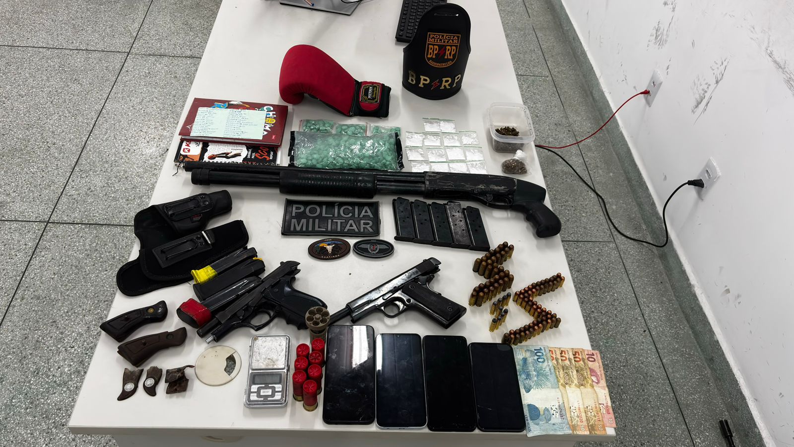 Ainda conforme o BPRp, foram apreendidos: duas pistolas, uma espingarda, munições de arma de fogo, 13g de cocaína, 20g de maconha, cerca de 360 comprimidos, um total de R$ 260 em espécie, quatro celulares, uma balança de precisão e acessórios para as armas.