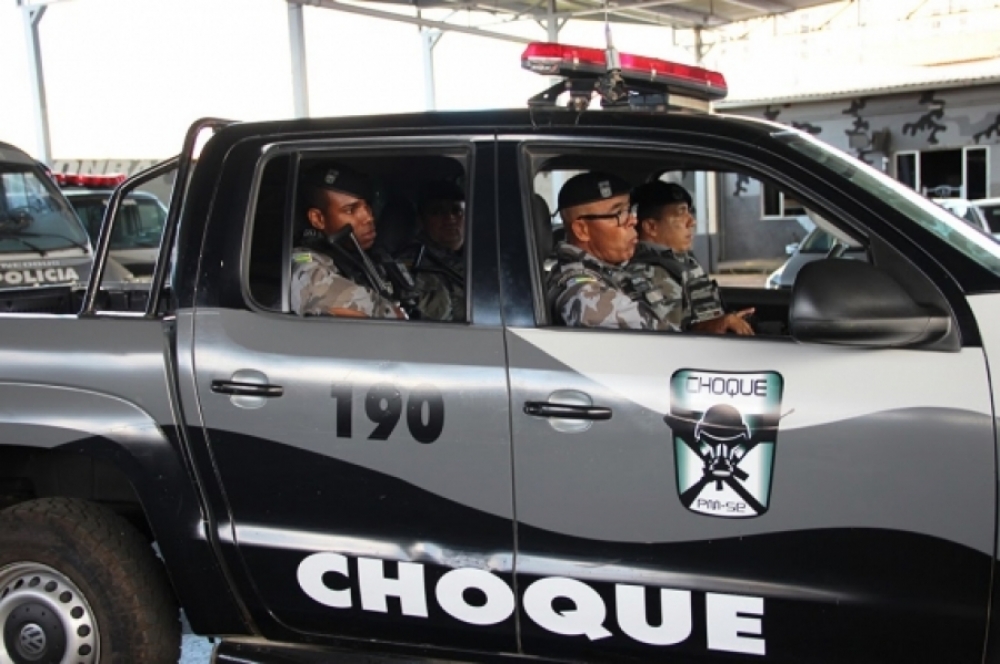 | Equipe do Batalhão de Choque encaminham suspeitos à Delegacia de Polícia (Foto: Ascom/PM) |