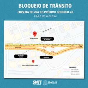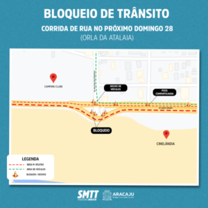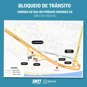 O trânsito na avenida Santos Dumont, na Orla da Atalaia, sofrerá alterações neste domingo, 28. A via ficará bloqueada das 5h às 9h para realização de uma corrida de rua, e também das 13h às 22h, para realização de um evento festivo.