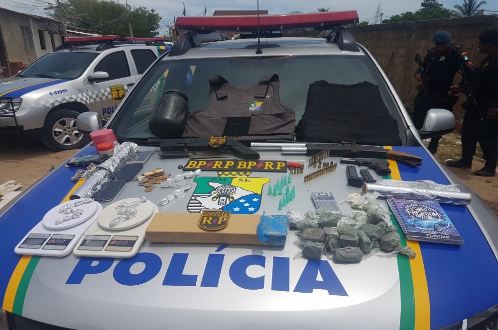 Durante a incursão, vários jovens evadiram pelos barracos, sendo estes interceptados e nas diligências, foram apreendidaos os seguintes: 01 pistola cal. 32 mm, 02 escopetas cal. 12 mm, 40 munições de diversos calibres, 01 carregador de pistola Cal. 380 mm, 04 pares de coletes antibalísticos, 02 facas, 20 gramas e 05 pedras de crack, 1,15 Kg e 42 papelotes de maconha, 179 gramas e 18 cápsulas contendo cocaína, 60 cápsulas vazias para acondicionamento de cocaína, 04 balanças de precisão, dentre outros objetos, sendo o caso encaminhado ao DENARC.