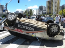 capotou. Com o impacto, a soldado Marcela que vinha na viatura ficou ferida e foi socorrida pela equipe do Serviço Móvel de Urgência e Emergência (Samu). O soldado Santos explica que a militar ficou muito nervosa e sofreu ferimentos leves. Com a colisão o trânsito ficou lento Foto: Portal Infonet