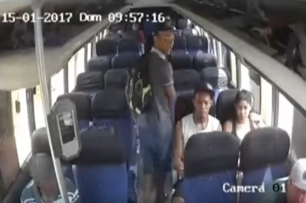 Como é possível perceber no vídeo, o homem entra rapidamente, aborda o motorista, depois segue para o fundo do veículo, leva os pertences dos passageiros e volta para a frente, deixando o veículo em seguida.