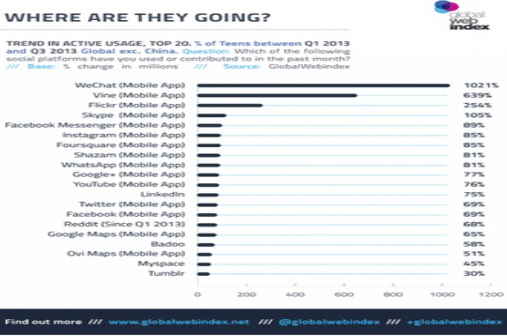 Segundo a escritora, consultora e palestrante nas áreas de marrketing digital, Martha Gabriel [em texto publicado no Facebook], os jovens estão indo para WeChat [disponível em todo tipo de plataforma; desfrute chat em grupo; permite voz,foto,vídeo e mensagens de texto], Vine [nova maneira de se divertir e conversar facilmente por vídeo com amigos], flickr [site de hospedagem e partilha de imagens fotográficas e desenhos], Skype [Programa para fazer ligações grátis ou mais baratas a partir do computador].