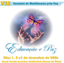 De acordo com um dos membros do Instituto de Cultura Espírita, Francisco Eustachio, o Encontro de Mobilização pela Paz nasceu da observação, em nossa comunidade, de atos de violência e agressão, em especial na família. “E o encontro visa através da educação dos nossos pensamentos e dos nossos atos promover a auto-transformação, realizada através de ações cotidianas de não-violência, de compaixão, de caridade e de amor”, explica. O público alvo do evento são os educadores e trabalhadores do Instituto de Cultura Espírita, todas as 180 crianças e jovens atendidas pelo Projeto Viver Como Jesus, pais e mães dessas crianças e jovens, professores e dirigentes de escolas da Cora do Meio e a comunidade do bairro Coroa do Meio em geral. A jornalista Dora Incontri, Doutora em Educação pela USP, participará do nosso evento com palestras. Dora é respeitada educadora que se dedica há mais de 20 anos à pesquisa sobre Educação e é autora de inúmeras obras sobre o tema. O encontro tem quatro princípios: ‘A paz começa em mim’; ‘A paz é uma proposta: não uma imposição’; ‘A arte: que desperta, que cura, que estimula’ e ‘O Evangelho: Jesus, o Mestre do amor que mobiliza a paz’. E está estruturado em três frentes de trabalho, conhecidas por: Ações pela Paz (ações realizadas em nossa comunidade durante o segundo semestre de 2006); Encontro de Mobilização pela Paz (é o encontro, propriamente dito) e Arte pela Paz (é um encontro, à céu aberto, em uma praça da comunidade, com palco para apresentações artísticas). Programação Dia 1º 19h30: Abertura Local: Escola Juscelino Kubitschek Arte pela Paz Reflexão: Educação e Paz Vibração pela Paz Dia 2 8h30 O que a Educação tem haver com a Paz? Auto-educação e Paz Dia 3 14h30 A proposta de paz dos grandes educadores A pedagogia de Jesus Dia 11 18h30 Dinâmica: Apresentação dos grupos Dia 12 16h – Arte pela paz Programação especial de Arte (música, dança e teatro)