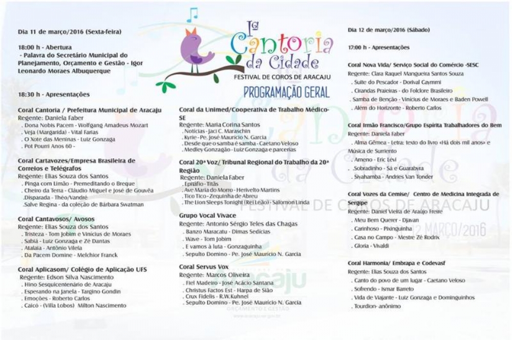 Sob um viés cultural, a Prefeitura de Aracaju por meio da Secretaria Municipal do Planejamento, Orçamento e Gestão (Seplog), promove neste final de semana, nos dias 11 e 12 de março, um encontro de coros de vozes. Cantar, fomentar e encantar, essa é a proposta do 1ª Cantoria da Cidade que será realizado no Centro Cultural de Aracaju. O festival conta com o apoio da Fundação Cultural Cidade de Aracaju (Funcaju) e a Secom.