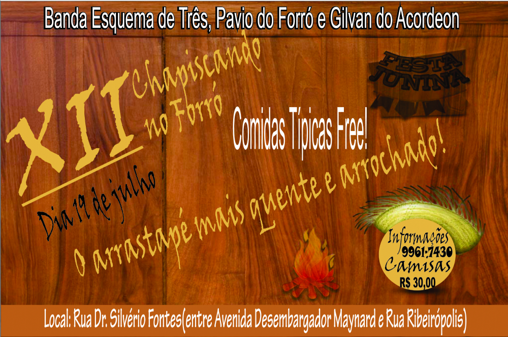 A festa é com camisas que são vendidas pra que possamos pagar toda estrutura. O evento terá as bandas Escama de Peixe, Pavio do Forró e Gilvan do Acordeon.