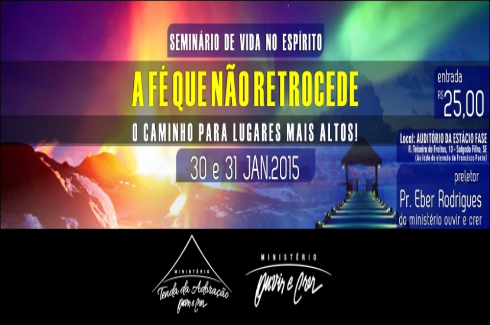 Acontecerá nos dias 30 e 31 de Janeiro de 2015 o 1º Seminário de Vida no Espírito em Aracaju ministrado pelo Pr. Éber Rodrigues, Pastor e presidente do Ministério Ouvir e Crer em Goiânia. A realização é do Ministério Tenda da Adoração Ouvir e Crer em Aracaju. Serão dias de muito poder, muita glória, unção e ensinamento da Palavra através do Sr. amigo Espírito Santo.