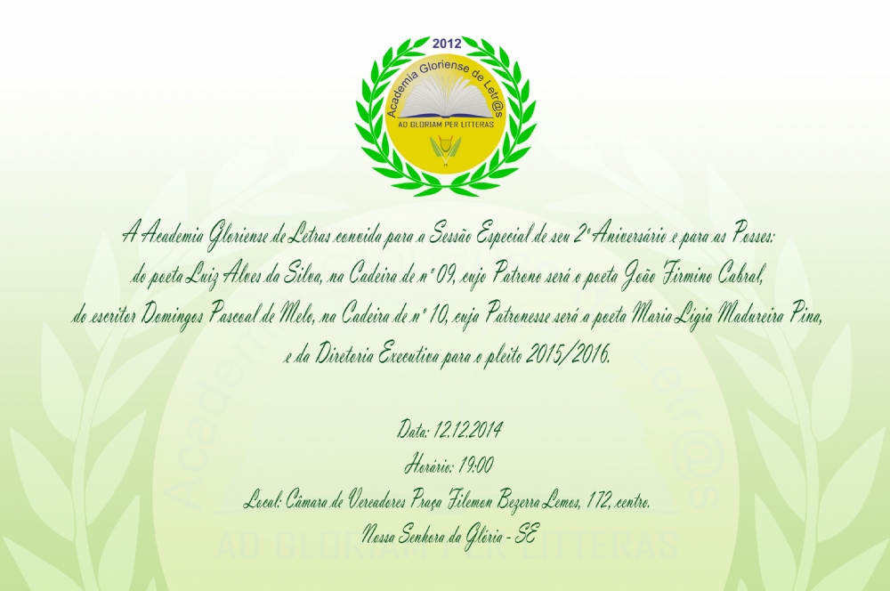 Nessa ocasião, em que festeja dois anos de atuação, a Academia Gloriense de Letras dará posse a dois novos membros: o poeta do cordel Luiz Alves da Silva, conhecido como Gauchinho, que ocupará a Cadeira de nº 09, cujo Patrono será o também poeta do cordel João Firmino Cabral; e o escritor e conferencista Domingos Pascoal de Melo, que ocupará a Cadeira de nº 10, cuja Patronesse será a poeta e educadora Maria Lígia Madureira Pina.