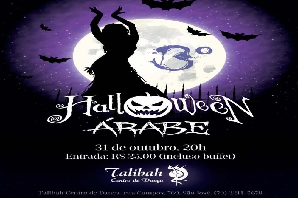 A Talibah Centro de Dança convida a todos vocês a assistirem a uma dança de qualidade, numa noite bem instigante, na 3° edição do Halloween Árabe, dia 31, às 20h. Os ingressos podem ser adquiridos no próprio centro de dança Talibah, no valor de R$ 25,00 com buffet incluso.