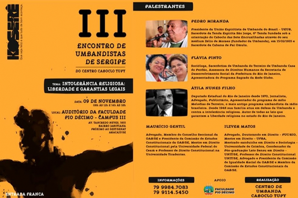 O evento contará com a participação de Átila Nunes Filho, apresentador do programa de rádio Melodias de Terreiro, mais antigo programa umbandista da rádio brasileira; Flávia Pinto, sacerdotisa do Terreiro de Umbanda Casa do Perdão; Pedro Miranda, presidente da União Espiritista de Umbanda do Brasil (UEUB); Maurício Gentil, membro do Conselho Seccional da OAB/SE; e Ilzver Matos, presidente da Comissão de Igualdade Racial da OAB/SE e membro da Comissão de Estudos Constitucionais da OAB/SE.