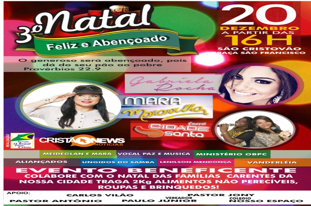 No dia 20 desse mês acontece a 3ª edição do Natal Feliz e Abençoado na Praça São Francisco, em São Cristóvão. Gabriela Rocha, Mara Maravilha, Forró Cidade Santa e outras atrações. O evento é beneficiente e o público poderá contribuir com 2Kg de alimentos, além de roupas e brinquedos.