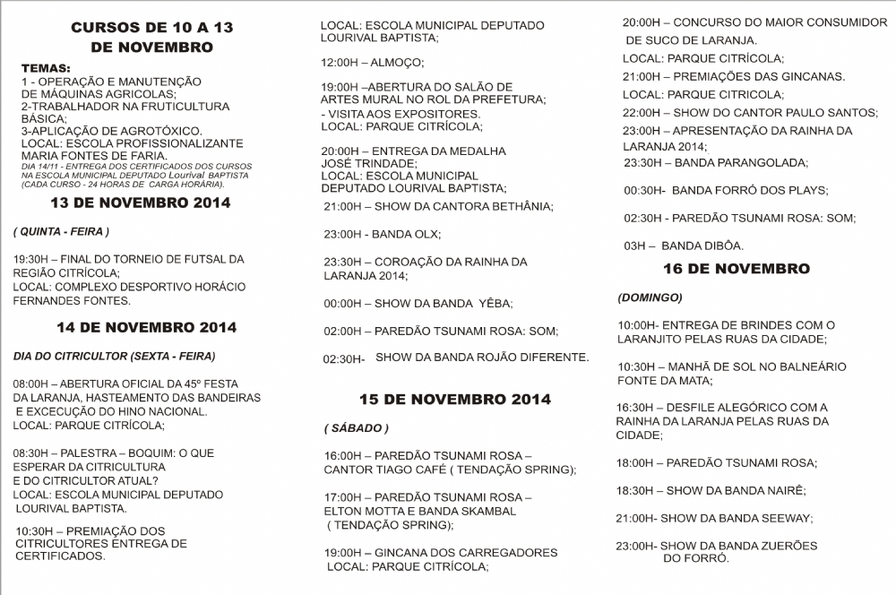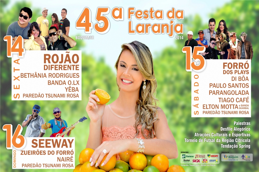 A Prefeitura de Boquim está preparando a sua tradicional “ Festa da Laranja”, que será realizada no dias 14, 15 e 16 de novembro. O evento, que busca congraçar os citricultores e colocar em discursos problemas que afetam o setor, terá também shows artísticos, exposição de arte e produtos e implementos agrícolas, cursos, exposições, além de mostrar o principal produto: a laranja e também potencialidade local.