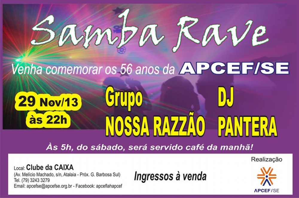 A Associação do Pessoal da Caixa Econômica Federal (APCEF/SE) completa mais um ano de existência que será comemorado com Samba e Música Eletrônica numa grande festa ao longo da madrugada da sexta-feira, 29 de novembro, no Clube da associação, localizada na avenida Melício Machado, vizinho ao Hiper Sales Sul.