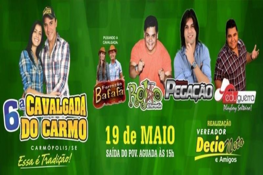 Tudo pronto para a realização da 6ª Cavalgada do Carmo, que acontecerá no próximo domingo, dia 19, em Carmópolis. A montagem da estrutura de palco e acessos já foi concluída. A festa começa às 13h na praça principal do povoado Aguada e termina na Praça e Eventos do município, onde se apresentarão as bandas Rojão Diferente, Forró da Pegação e Edu Guerra.