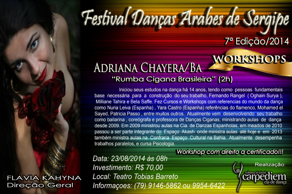Este ano a Cia de Dança Carpe Diem (SE) existente a 14 anos, estará homenageando o nosso Estado com o Espetáculo “ Minha terra é Sergipe”, trabalhando Fusão de Estilos e buscando inovação sempre, apresentará um trabalho composto por músicas de Artistas da terra com movimentos do Folclore Sergipano unidos a Arte Oriental, através das coreografias dinâmicas da Coreógrafa Flavia Kahyna(SE). O público Sergipano irá apreciar também a Arte da Dança do Ventre em geral juntamente com a Dança Árabe Tradicional em uma noite super especial recheada de encanto e magia.